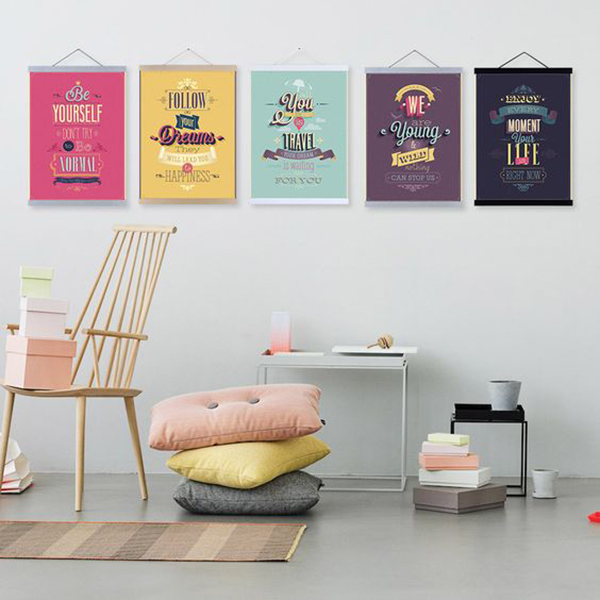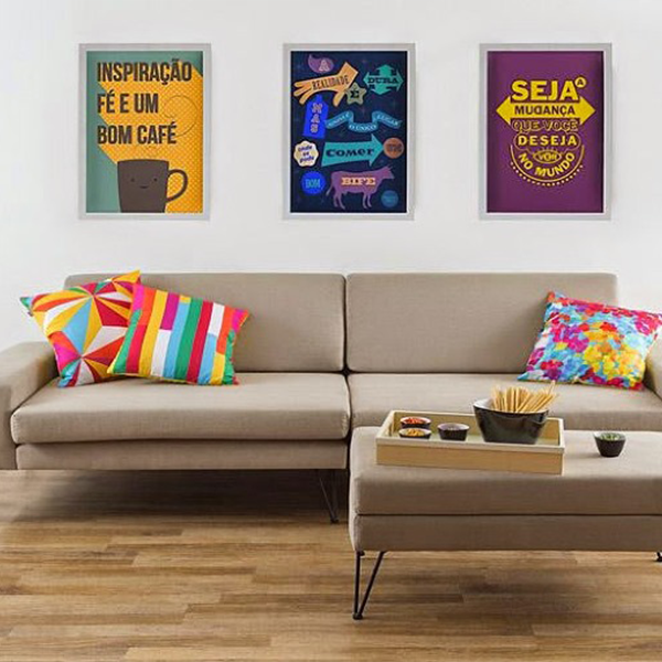 Depois de escolher quantos quadros e quais temas irão compor sua decoração, você pode optar por usar ou não molduras nos pôsteres. Ambientes mais despojados podem ser decorados com pôsteres fixados diretamente na parede com o auxílio de uma fita dupla-fase ou adesivos coloridos. Já os ambientes mais clássicos, exigem pôsteres com molduras, o que garante mais conservação dos seus quadros.